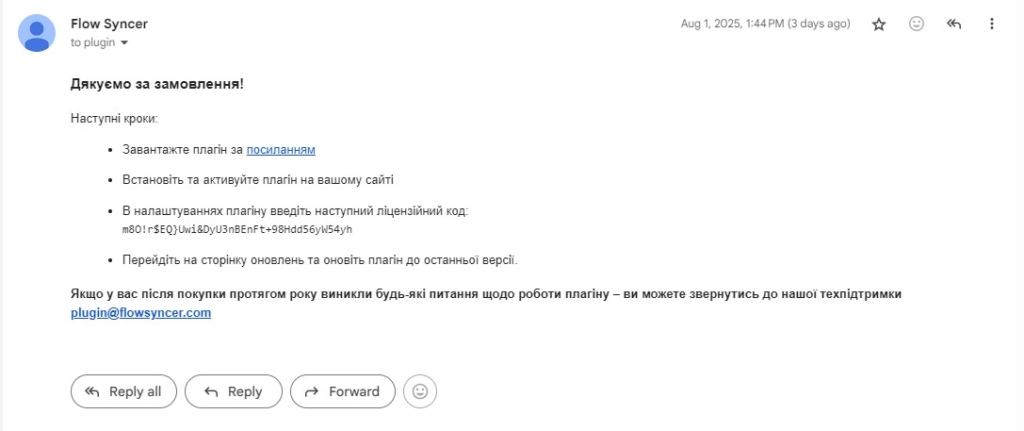 Після замовлення ви отримаєте на пошту, яка вказана в процесі замовлення (або на вказану на сторінці оплати в платіжній системі) лист наступного змісту:
