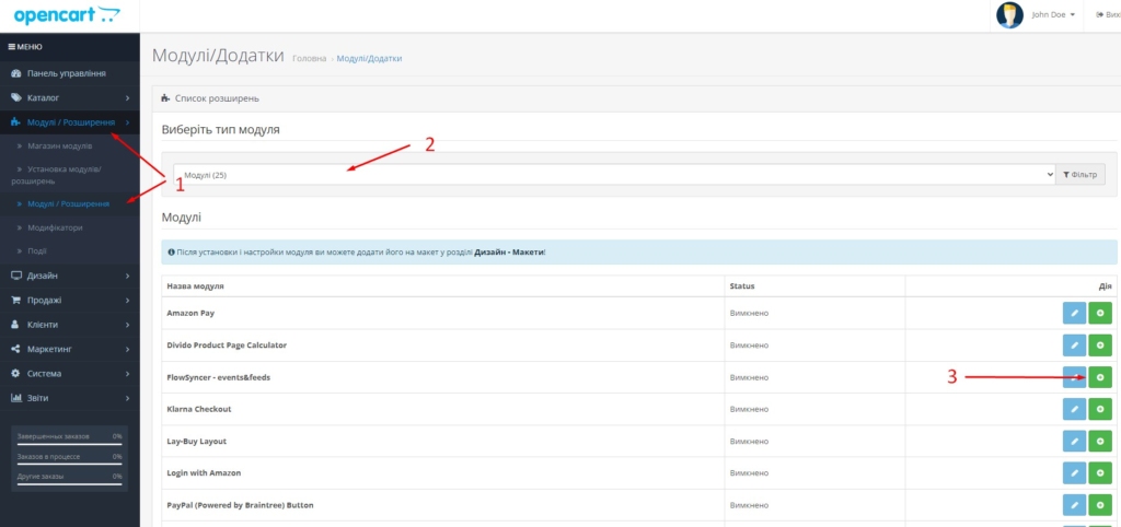 - Перейдіть в список встановлених модулів, оберіть тип модулів “Модулі“, знайдіть в списку наш модуль і натисніть “зелений плюс” для встановлення: